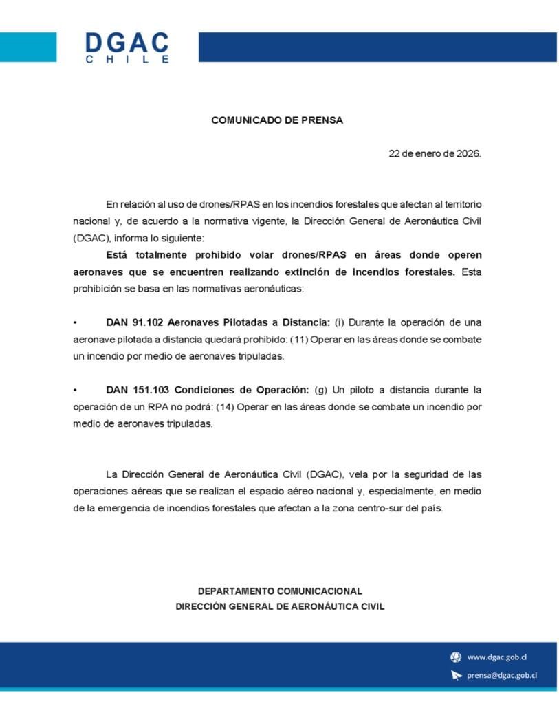 La Dirección General de Aeronáutica Civil (DGAC) reiteró que está estrictamente prohibido el uso de drones/RPAS en áreas donde operen aeronaves dedicadas al combate de incendios forestales, medida que busca resguardar la seguridad de las operaciones aéreas y proteger la vida de pilotos, brigadistas y personal de emergencia.